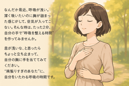 息が浅いな、と感じたら、ちょっと立ち止まって、自分の胸に手を当ててみてください。それは、誰にも頼らずがんばっているあなた自身に、そっと「大丈夫だよ」と伝える行為でもあります。